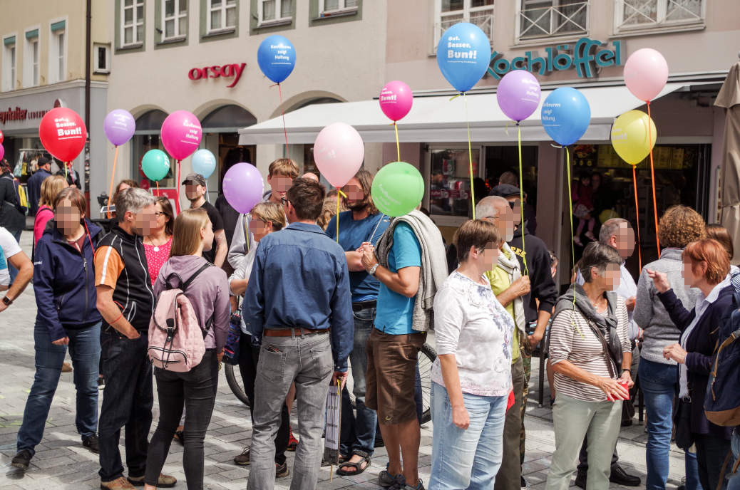 Mit Sprechchören, Pfiffen und Buhrufen machten Jugendliche in unmittelbarer Nähe zu Stürzenberger ihrem Unmut gegen dessen »menschenverachtende« Thesen Luft. Die Initiative für Frieden, Internationalen Ausgleich und Sicherheit rief dazu auf, sich an dem anstehenden Bürgerentscheid im Sinne der Moschee zu beteiligen und verteilte Rote Karten, die den, wie es darauf hieß, »rechtsradikalen Hasspredigern« am Mikrofon entgegen gehalten wurden. Der Stadtjugendring gab nach eigenen Angaben mehr als 800 bunte Luftballons aus, eine Blaskapelle protestierte musikalisch. Nonnen aus dem angrenzenden Kloster demonstrierten neben Mitgliedern der christlichen und muslimischen Gemeinden Kaufbeurens.