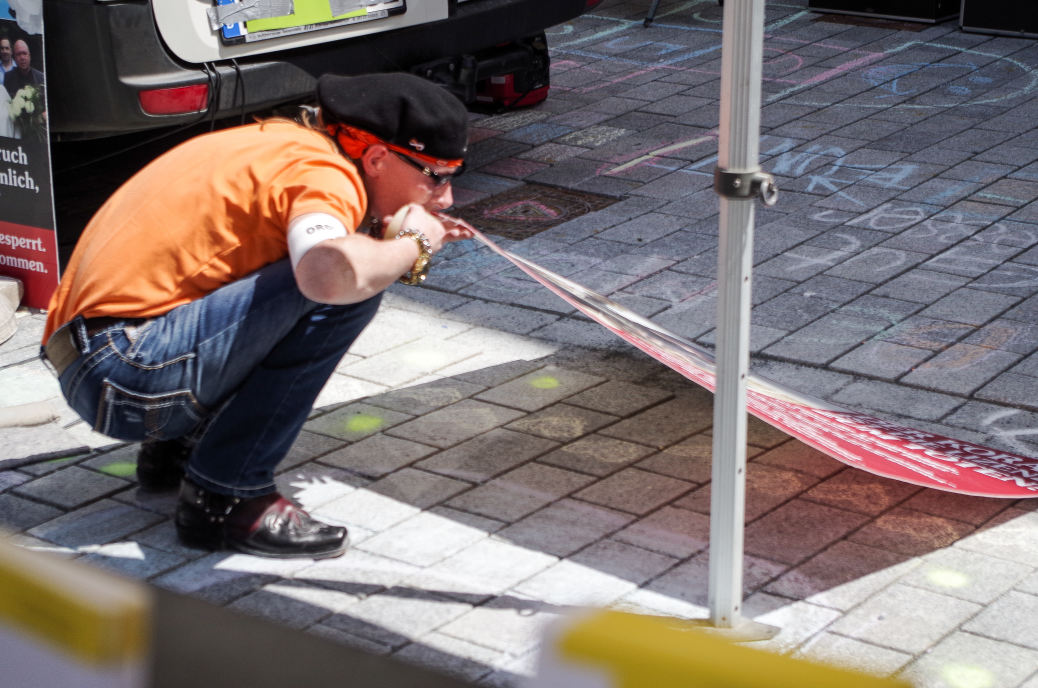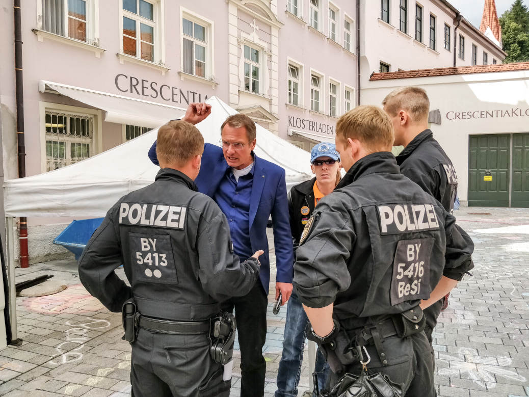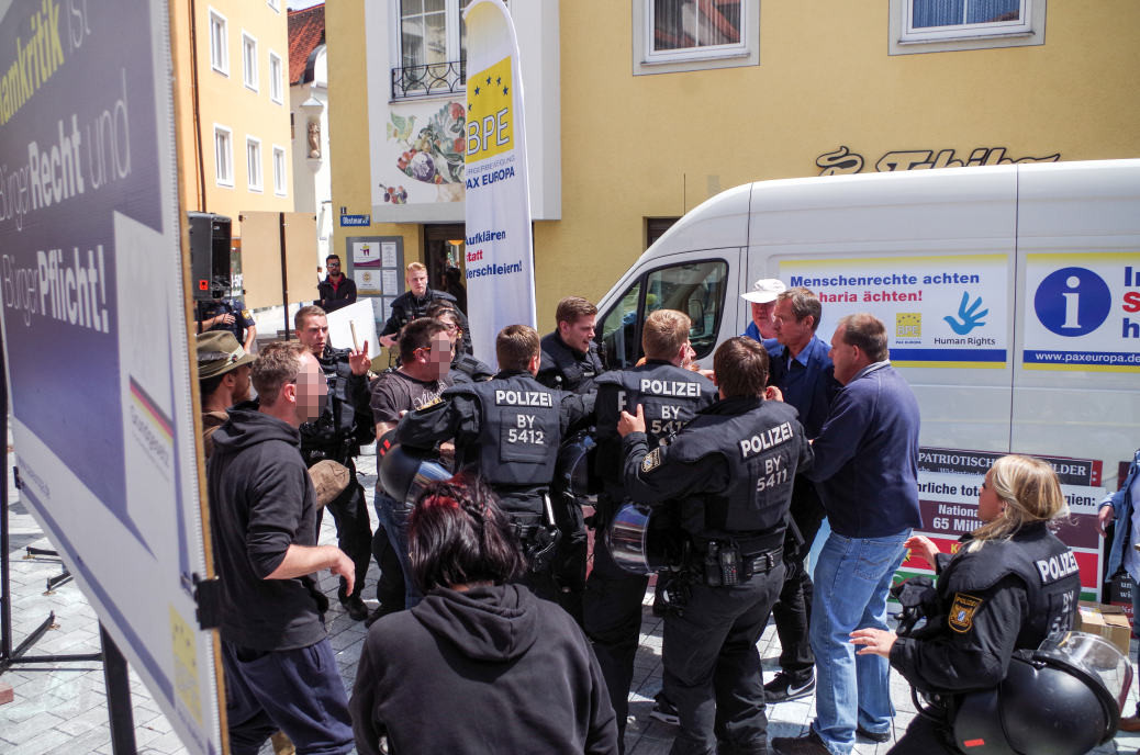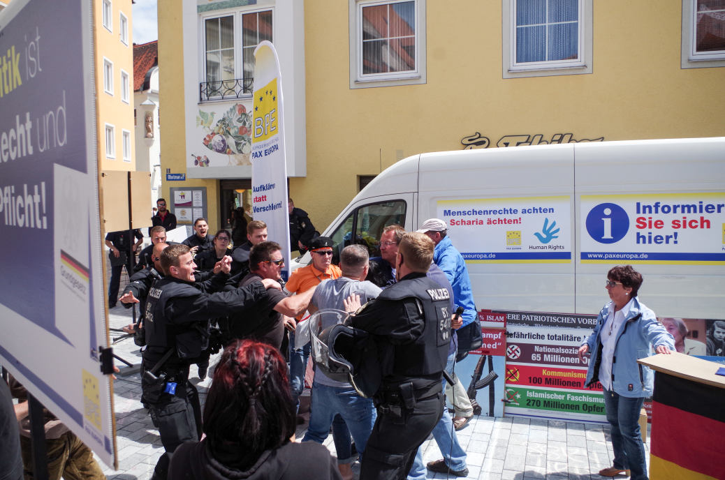 Auf der Kundgebungg in Kaufbeuren kommt es zu einem Zwischenfall: Eine Frau versuchte einem Helfer ein Plakat zu entreißen, Stürzenberger soll sie verletzt haben.