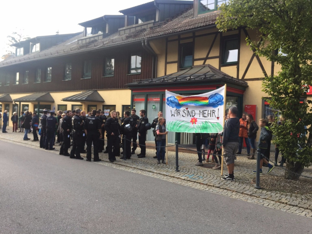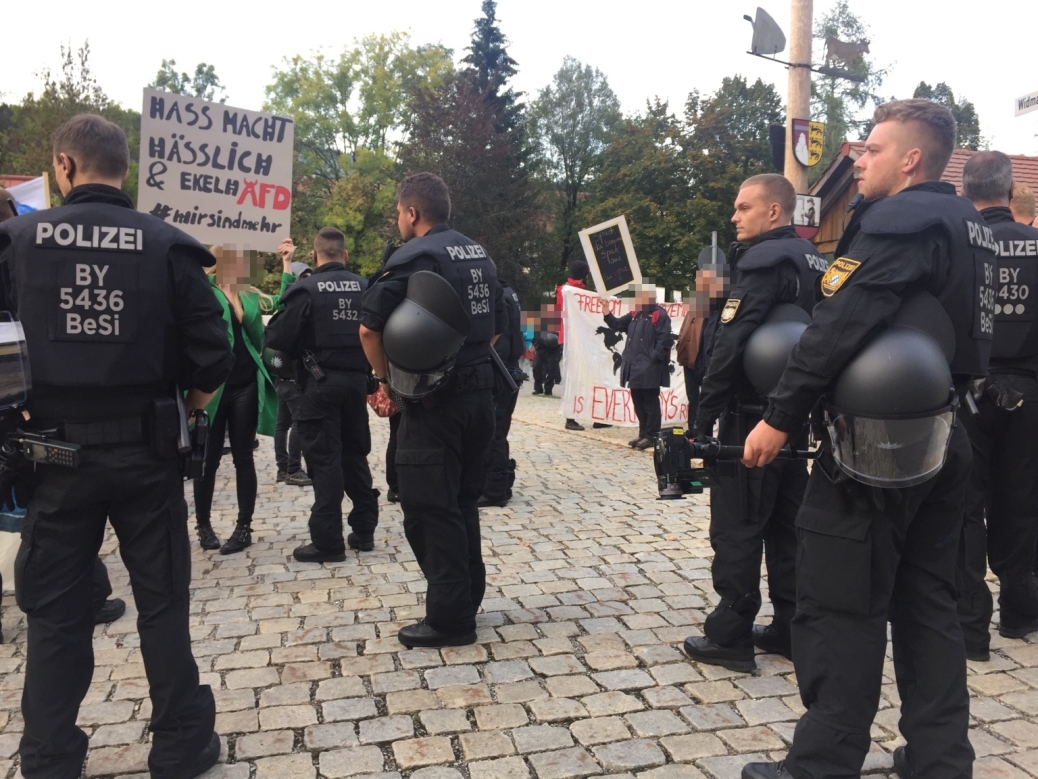 Rund 500 Personen versammelten sich daher auf Einladung eines breiten Bündnisses. Laut Anmeldung wurde ihnen als Versammlungsfläche ein Bereich hinter der Feuerwehr zugewiesen. Einige AfD-Gegner waren damit unzufrieden. Sie empfanden den Platz als zu weit von den Adressaten ihres Protestes entfernt. Um in Hör- und Sichtweite der Veranstaltung der Rechtsaußen-Partei demonstrieren zu können, versammelten sich rund 100 weitere Personen direkt am Gasthof Goldener Adler und meldeten eine Spontanversammlung an.