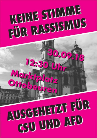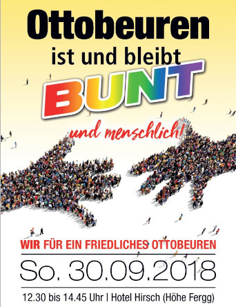 Auch die Initiative Keine Stimme für Rassismus hat eine Veranstaltung angemeldet. Der wollte sich »Ottobeuren ist und bleibt bunt« aber nicht anschließen, erklärt Susanne Marinovic auf Anfrage von Allgäu ⇏ rechtsaußen. »Wir haben lange überlegt, ob wir uns der anderen Gegenveranstaltung anschließen sollen, entschieden uns dann aber dafür, dass wir der Ottobeurer Bevölkerung eine eigene Plattform geben möchten. Wir möchten unser Ottobeuren feiern, möchten aufstehen für die Werte einer kleinen aber weltoffenen, menschlichen, fröhlichen und eben bunten Gemeinde im Unterallgäu«, so die Sprecherin der Initiative.