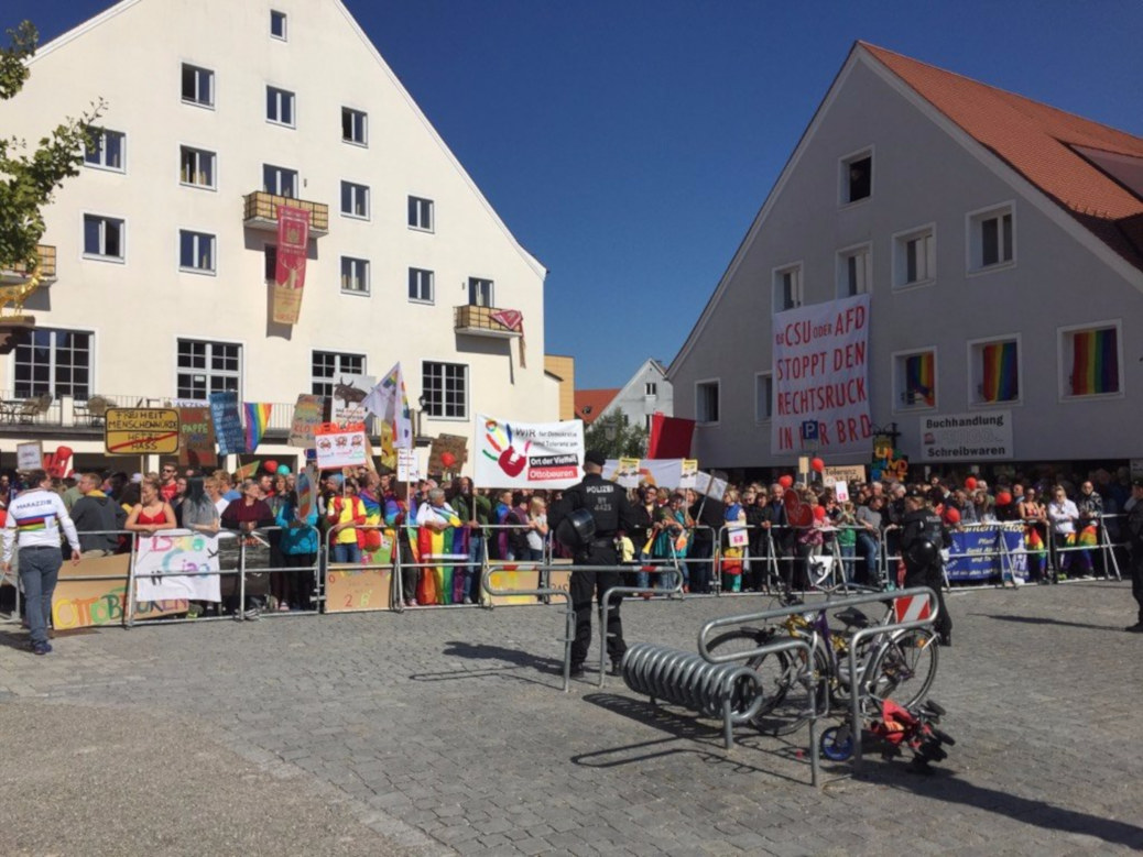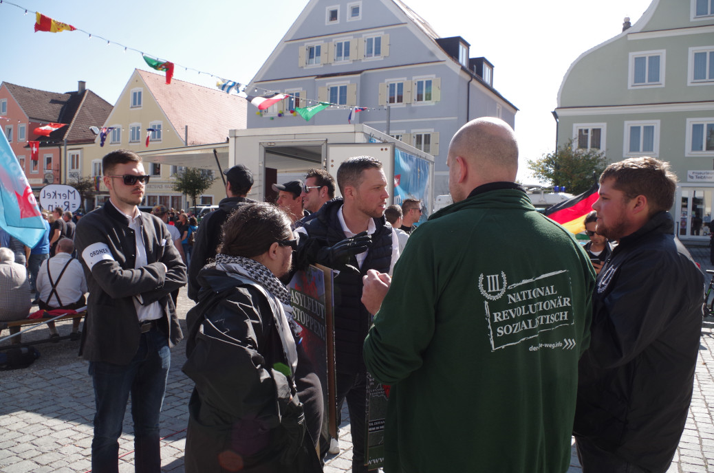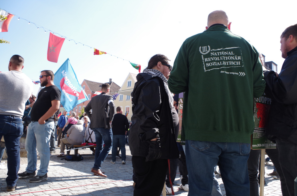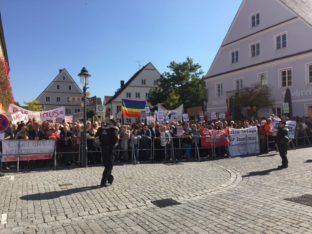 Mehr als eintausend Menschen protestieren gegen die Anti-Merkel-Kundgebung der AfD in Ottobeuren, die deutlich kleiner ausfällt als erwartet. Dafür wird die AfD von Anhängern der Identitären Bewegung und der Neonazipartei Der Dritte Weg unterstützt.