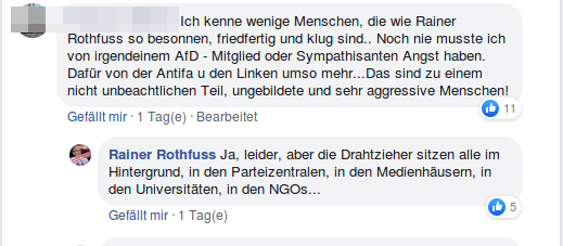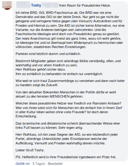 Ein Facebooknutzer der sich selbst als »Toshy« bezeichnet erklärt im Kommentar zum oben zitierten Beitrag von Rothfuß: »Bestimmte Mitglieder geben sich allerdings Mühe verständig, offen, und wahrhaftig und vor allem friedlich zu sein. Herr Rothfuß gehört sicher dazu. Ihm so schädlich zu behandeln ist einfach nur unerträglich.« Im selben Atemzug trägt »Toshy« seine demokratiefeindliche und von Reichsbürgerideologie durchdrungene Einstellung offen zur Schau: »Ich lehne BRD, GG, BRD-Faschismus ab. Die BRD war nie eine Demokratie und das GG ist der letzte Dreck.« In Rothfuß scheint der rechtsradikale Facebooknutzer jedoch ein Idol gefunden zu haben. Für ihn gehört der Vorsitzende der AfD Lindau »von den aktuell Bekannten Menschen in der Politik […] wohl aktuell zu den feinsten MENSCHEN«.