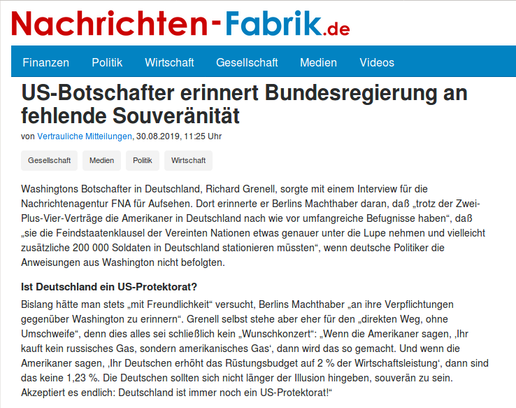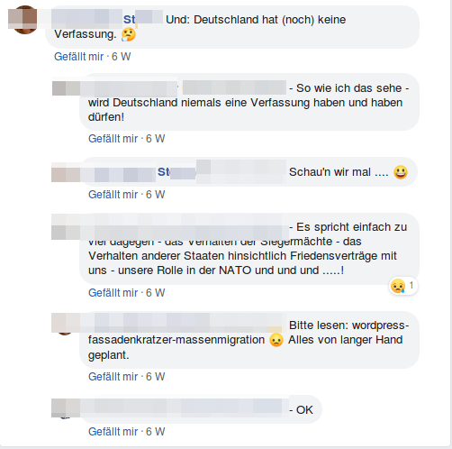 Besonders bemerkenswert ist jedoch insbesondere die von St. und vielen weiteren Mitgliedern der Gruppe betriebene Leugnung der Existenz der Bundesrepublik Deutschland. Dies stellt das zentrale Erkennungsmerkmal der Reichbürgerbewegung dar und wird in der Lindauer Runde durch ausschweifende Ausführungen untermalt. In einem von St. geteilten Beitrag des Reichsbürgerportals Nachrichten Fabrik wird beispielsweise die Behauptung aufgestellt, der US-Botschafter habe die Bundesregierung an deren fehlende Souveränität erinnert. Auf der Grundlage verschiedener weiterer Falschbehauptungen heißt es darin schließlich: »Die Deutschen sollen sich nicht länger der Illusion hingeben, souverän zu sein. Akzeptiert es endlich: Deutschland ist immer noch ein US-Protektorat!«
