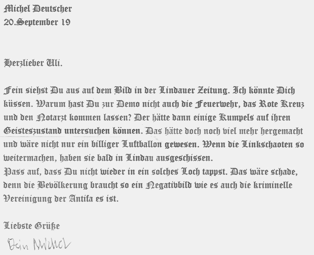 Auch außerhalb der Sozialen Medien ergreift eine Person mit rechtsradikaler Rhetorik Partei für Rothfuß und die AfD Lindau. In einem mit »Michel Deutscher« unterzeichneten Brief an den Anmelder der Anti-AfD Kundgebung in Nonnenhorn heißt es dabei: »Wenn die Linkschaoten so weitermachen, haben sie in Lindau bald ausgeschissen.« Im Folgenden geht der anonyme Verfasser des Briefes noch weiter. Der Adressat seines Briefes solle aufpassen, dass er nicht wieder in ein solches Loch fällt, heißt es dort in altdeuscher Frakturschrift.