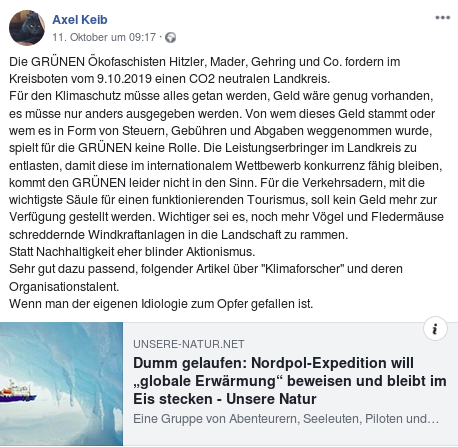 Tatsächlich diskutiert der Oberstaufener Gastwirt und AfD-Funktionär dort rege mit. Dabei offenbart er  einen intensiven und freundschaftlichen Austausch mit der Gruppengründerin und Administratorin der Gruppe Diana Maria Steffen. Sie fällt wie Keib immer wieder durch Aussagen auf, welche Gegner*innen der AfD in die Nähe des Nationalsozialismus rücken. So bezeichnete Keib lokale Vertreter*innen der Grünen jüngst öffentlich als Ökofaschisten und sprach mit Blick auf Proteste vor seinem Lokal davon, dass ihn diese »an die dunkelsten Zeiten unserer Deutschen Vergangenheit« erinnern würden.