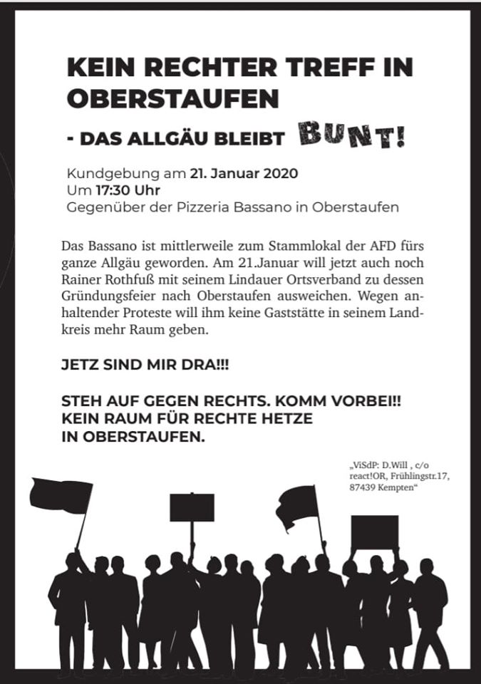 Im Aufruf zu der Kundgebungen mit dem Motto »Kein rechter Treff in Oberstaufen« warnt KSFR, Oberstaufen drohe sich durch die Pizzeria Bassano zunehmend zum Brennpunkt für rechte Treffen in der Region zu entwickeln. Etwa 75 Personen folgten am 21. Januar diesem Aufruf um nach eigenen Angaben »ein deutliches Zeichen gegen die Normalisierung rechter bis rechtsradikaler Positionen durch die AfD und für ein weltoffenes Allgäu zu setzen«.