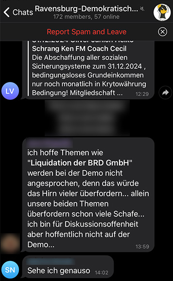 Wenn dann der, um Abgrenzung nach Rechts bemühte, Rechtsanwalt Klaus S. ernsthafte Kritik äußert und darauf aufmerksam macht, dass das typische Reichsbürger-Inhalte sind, werden sie halbherzig gelöscht. Unmittelbar danach wird seine Meinung zu dem Thema in Frage gestellt, denn es gebe für beide Seiten Argumente. Dem folgt eine Ausführung darüber, dass man am liebsten alle sofort zu 100 Prozent aufwecken wolle, das aber ein Prozess sei, in dem sich die Spreu vom Weizen trennt. Abschließend heißt es dann »alles zu seiner Zeit, wir sind in Position«.