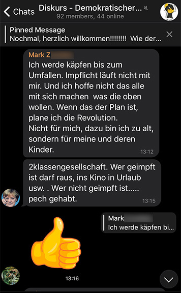 Aussagen, die Gruppenmitglieder selbst treffen, unterstreichen wie sehr die, zumeist auf einem antisemitischen Fundament errichteten, Verschwörungstheorien als Realität begriffen werden. Während Gerhard Fiegl, der Anmelder der Demo in Wangen im Allgäu, noch verhältnismäßig unverfänglich von »Machteliten« spricht, die ihren »grauenvollen Plan rücksichtslos durchziehen«, werden andere deutlicher. So erzählt Mark Z. vom angeblich geplanten Aufbau einer »NWO«, einer neuen Weltordnung, durch »die Eliten« und behauptet, dass es dazu genügend Aussagen von »Gates, Rockefeller, Soros, Rothschild und Konsorten« gebe – eine typisch antisemitische Erzählung. Ähnlich wie auch Matthias B. will Mark Z. kämpfen »bis zum Umfallen« und im Falle einer Impfpflicht plant er sogar die Revolution.