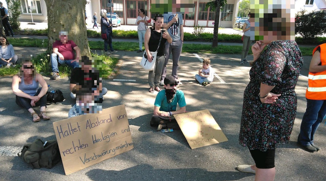 Vor vereinfachten Welterklärungen und Verschwörugnsmythen hatten Antifaschist_innen jüngst in einem Audio-Statement gewarnt. Der Glaube an eine im Geheimen wirkende mächtige Gruppe finsterer Verschwörer_innen sei historisch aufs Engste mit der Vorstellung verwoben, Jüdinnen und Juden seien diese Gruppe. Mit Schildern und einem Transparent intervenierte dann auch eine kleine Gruppe gegen die »Querfront«, die die Versammlung bilde und forderte »Abstand« zu »Verschwörungsmythen, Antisemitismus und rechten Positionen«, für die es keinen Platz geben dürfe.