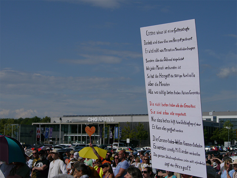 Auf einem Schild verband sein Träger eine bei Rechten aller Coleur beliebte rassistische und meist unausgesprochen antisemitische Verschwörungstheorie, nach der »Massenmigration« zur »Zerstörung Deutschlands« gesteuert würde mit der Corona-Krise. Letzteres sei »Phase 2« des Plans. Schon am Gitter, das die der Demonstration zugewiesene Fläche umgab hing neben einem »(ver)fassungslos«-Schild eines, das ebenfalls antisemitische Verschwörungstheorien bedient.