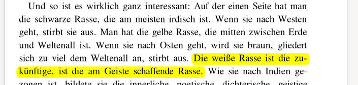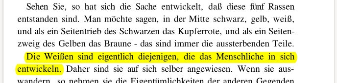 „Der Neger hat also ein starkes Triebleben. Und weil er eigentlich das Sonnige, Licht und Wärme, da an der Körperoberfläche in seiner Haut hat, geht sein ganzer Stoffwechsel so vor sich, wie wenn in seinem Innern von der Sonne selber gekocht würde. Daher kommt sein Triebleben. (…) Und so ist wirklich ganz interessant: Auf der einen Seite hat man die schwarze Rasse, die am meisten irdisch ist. Wenn sie nach Westen geht, stirbt sie aus. Man hat die gelbe Rasse, die mitten zwischen Erde und Weltenall ist. Wenn sie nach Osten geht, wird sie braun, gliedert sich zu viel dem Weltenall an, stirbt aus. Die weiße Rasse ist die zukünftige, ist die am Geiste schaffende Rasse. (…) Und so werden in der Zukunft gerade aus den Rasseeigentümlichkeiten solche Dinge hervorgehen, die man kennen muss, damit man sich richtig hineinstellt ins Leben.“1